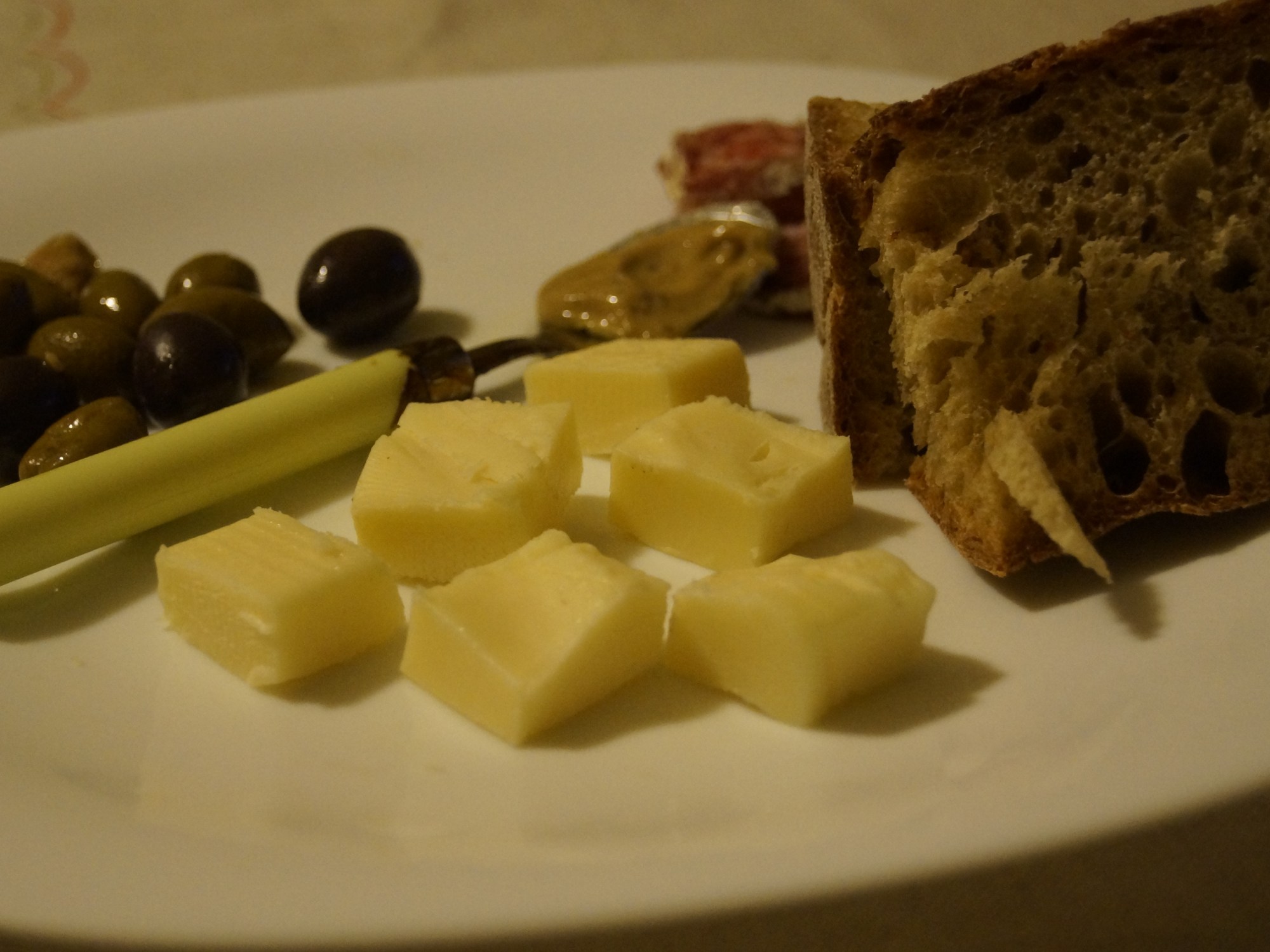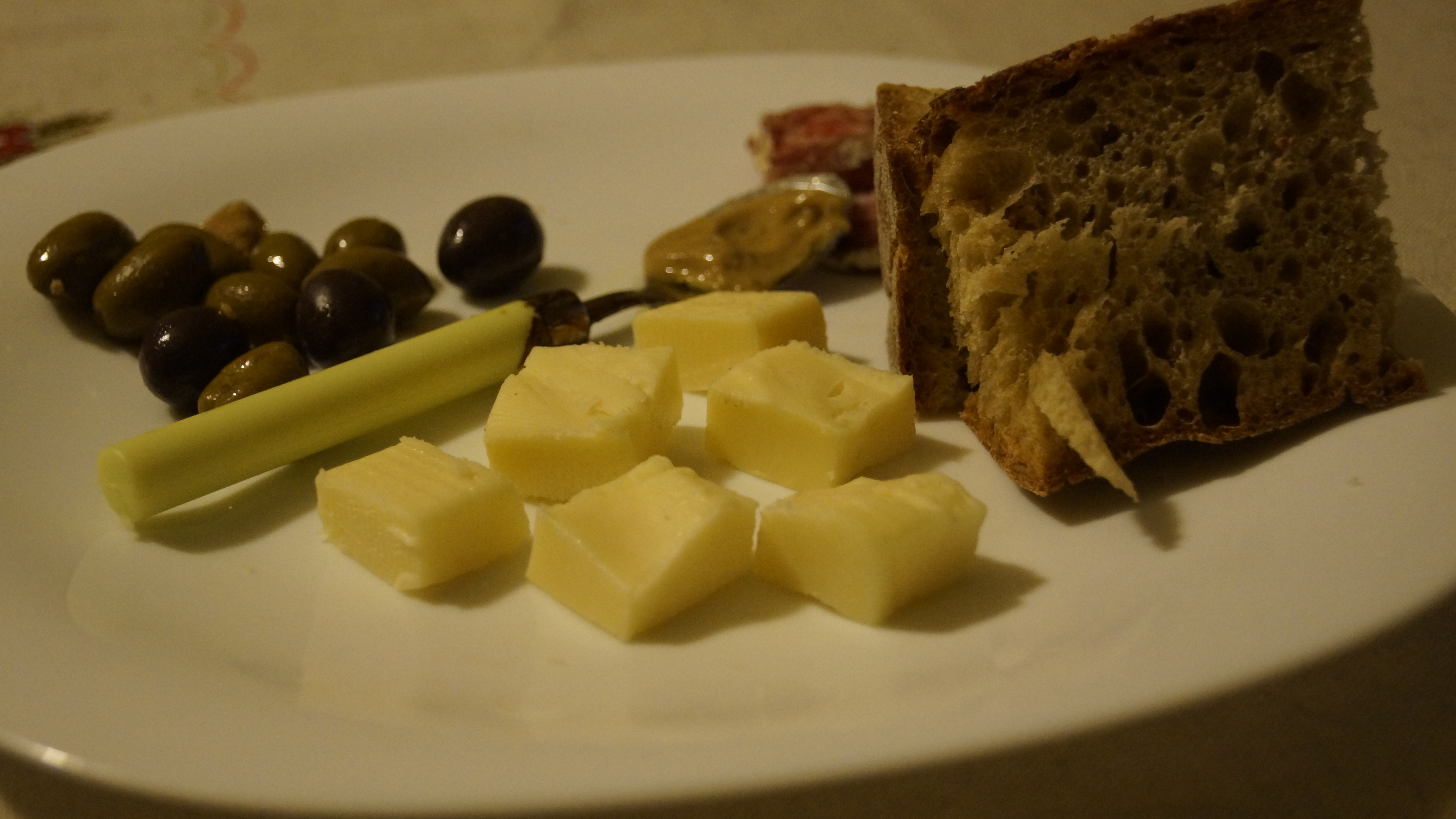 I have mixed olives (Kalamata and green), truffle infused salami, porcini mushroom cream, Calabrese bread and a semi-soft cow’s milk cheese. Pair with wine and good company. Chin chin!