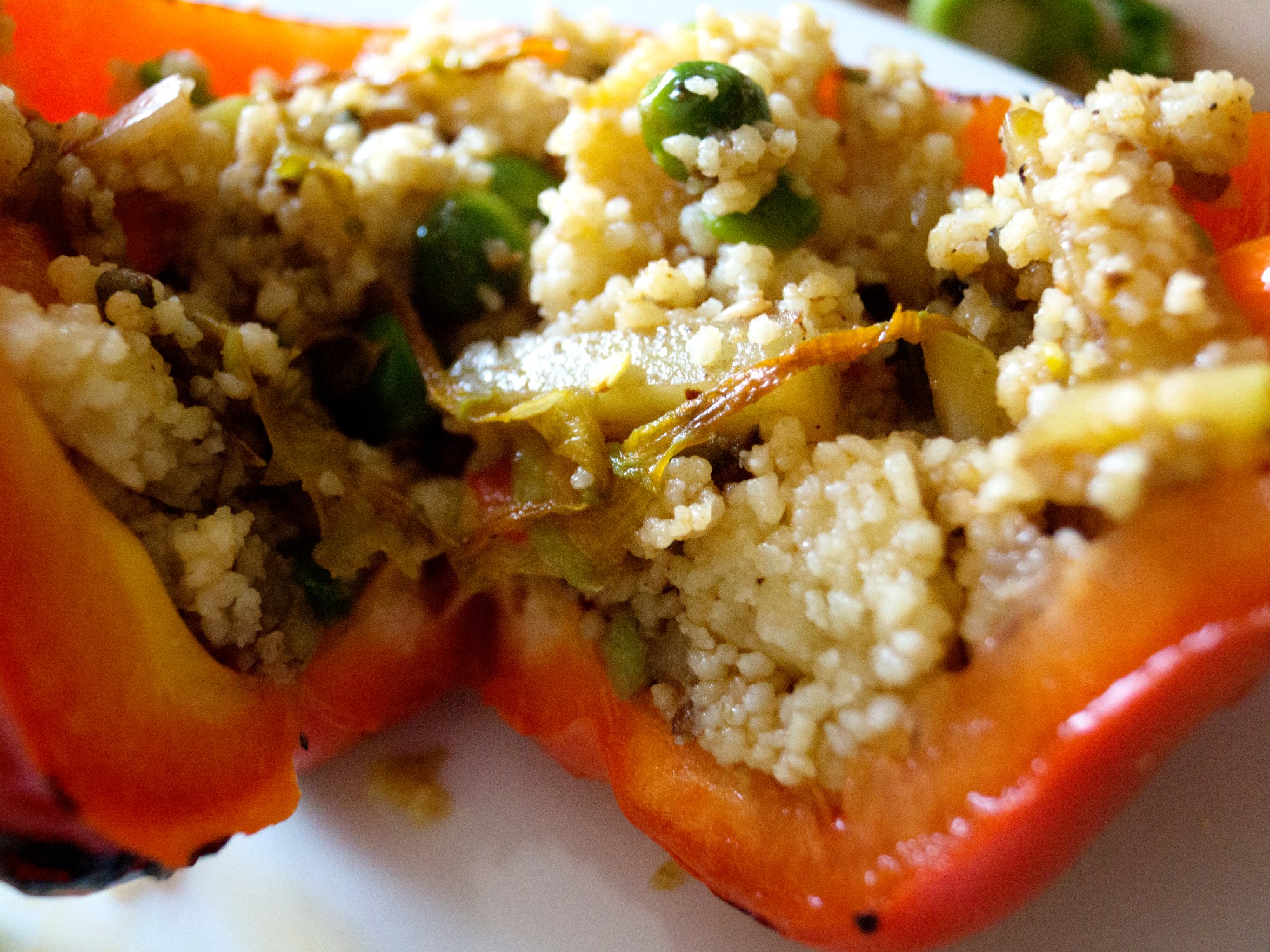 I also sautéed green onions, peas, and carrots. You can also toss in a few stamens of saffron. It really adds to the color and flavor. After that, I put the couscous aside and roasted the bell peppers whole, on an open flame on top of my stove (careful, if you’re clumsy like me because it can be a bit dangerious). After I got the char marks I wanted, I carved the tops off like a Halloween pumpkin. Voila! bell pepper bowls, or stuffed peppers–as normal people call them.